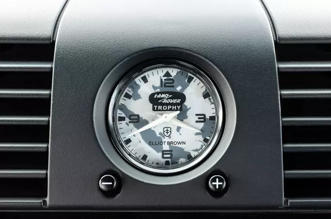 Charakterystycznym elementem wykończenia wnętrza będzie umieszczony w centrum deski rozdzielczej, wykonany na zamówienie przez Elliota Browna, zegar Land Rovera Trophy, którego unikalna tarcza odzwierciedla zewnętrzny wzór malowania. Elliot Brown po raz kolejny dostarczy właścicielom Trophy wyjątkowy, wytrzymały zegarek z edycji Competitor's Edition. Tymczasem dla tych, którzy nie mieli wystarczająco szczęścia, by zdobyć jeden z limitowanych pojazdów, Elliot Brown stworzy 1000 zegarków inspirowanych Land Roverem Classic Defender Works V8 Trophy II.