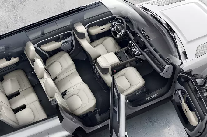 Wewnątrz dla każdego z pasażerów we wszystkich trzech rzędach siedzeń zapewnione są przemyślane rozwiązania w zakresie przechowywania i wygody. Dzięki temu Defender 130 dba o potrzeby pasażerów na każdym siedzeniu, dając swobodny dostęp do wygodnego, trzeciego rzędu w jasnej i przestronnej kabinie.