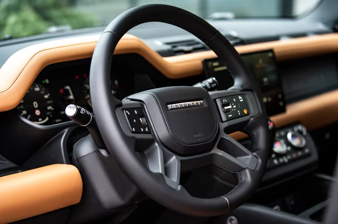 Trwałe i wszechstronne wnętrze Defendera poddane zostało podobnym zabiegom, a poprzecznica Cross Car Beam wykończona została matową farbą proszkową Grasmere Green i laserowo wytrawionymi detalami na nakładkach końcowych. Fotele wykończone zostały materiałem Resist Ebony, a oryginalna dźwignia zmiany biegów o kształcie kija hokejowego, znajdująca się na konsoli środkowej, wykonana została z Robustec – najbardziej wytrzymałego materiału dostępnego w Defenderze.
